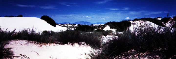 テキサス州のエルパソから北東に約130kmのところに公園はあり、エルパソからは車でのアクセスのみです。インターステート10を北に行くとすぐにニューメキシコ州に入り、さらに北東に2時間弱、潅木がところどころ生えているだけの乾燥した砂漠地帯をひた走ります。徐々に周りの風景は白っぽくなり、しばらくすると公園の入口の赤色の小屋が見えてきます。その入口を通り抜けると、道路、駐車場、何もかもが信じられないほど純白で幻想的な世界が目前に広がります。縦横約40キロに及ぶこの砂漠は石膏でできており、裸足で歩くと湿り気がなくさらさらで気持ちよく、思わず童心に帰って砂遊びをしたくなってしまいました。私は残念ながら見ることはできませんでしたが、夕暮れから夜にかけて、特に満月の夜の風景はすばらしいとのことでした。